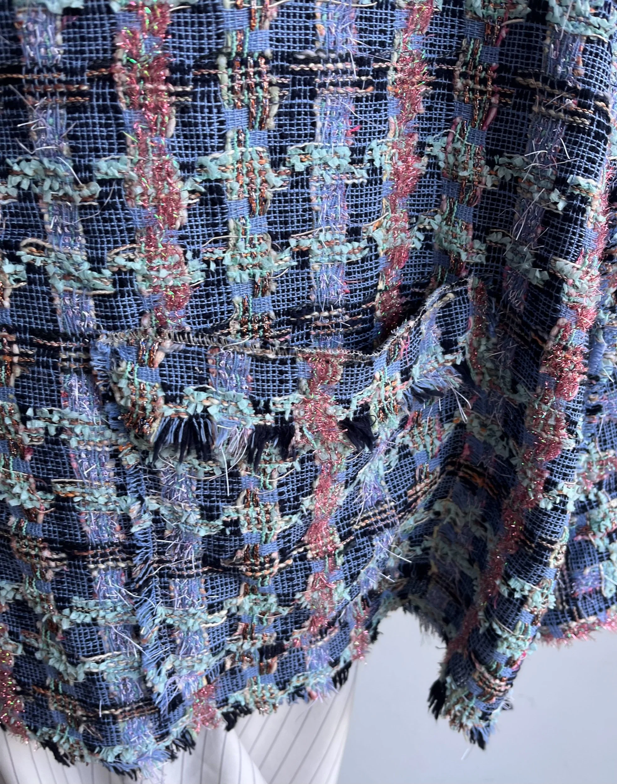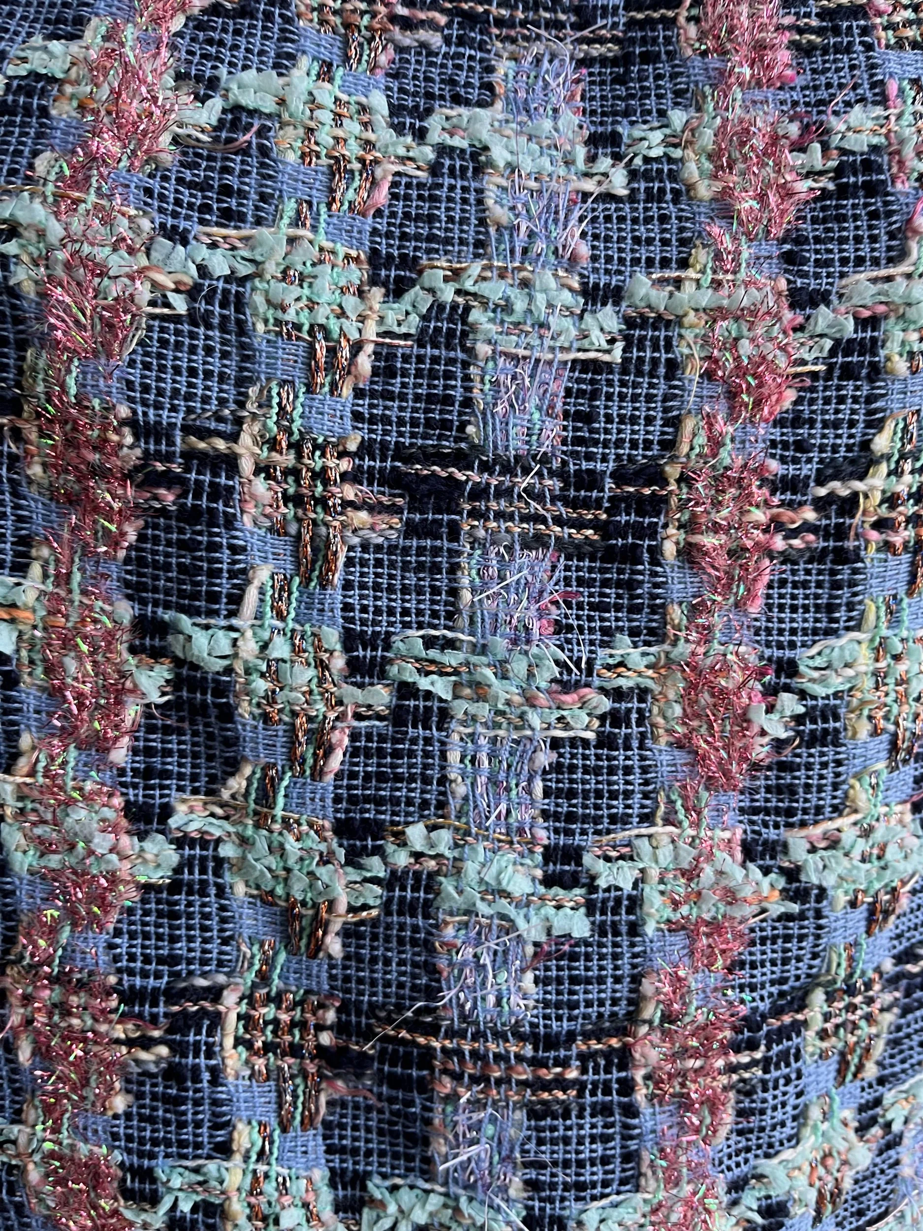 It is made in shades of blues,turquoise and a pink lurex.