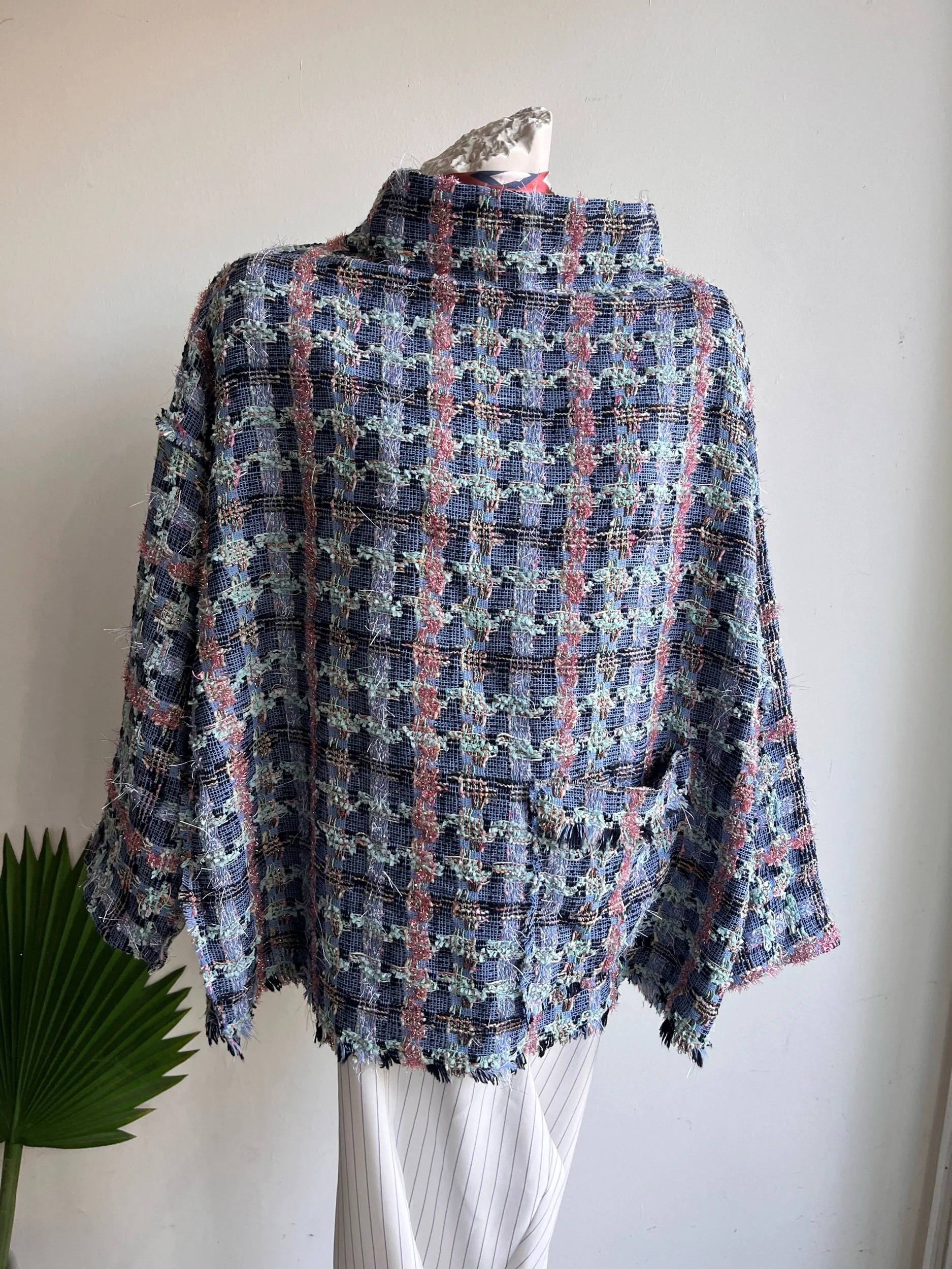 It has a stand up collar and fringed pocket detail.